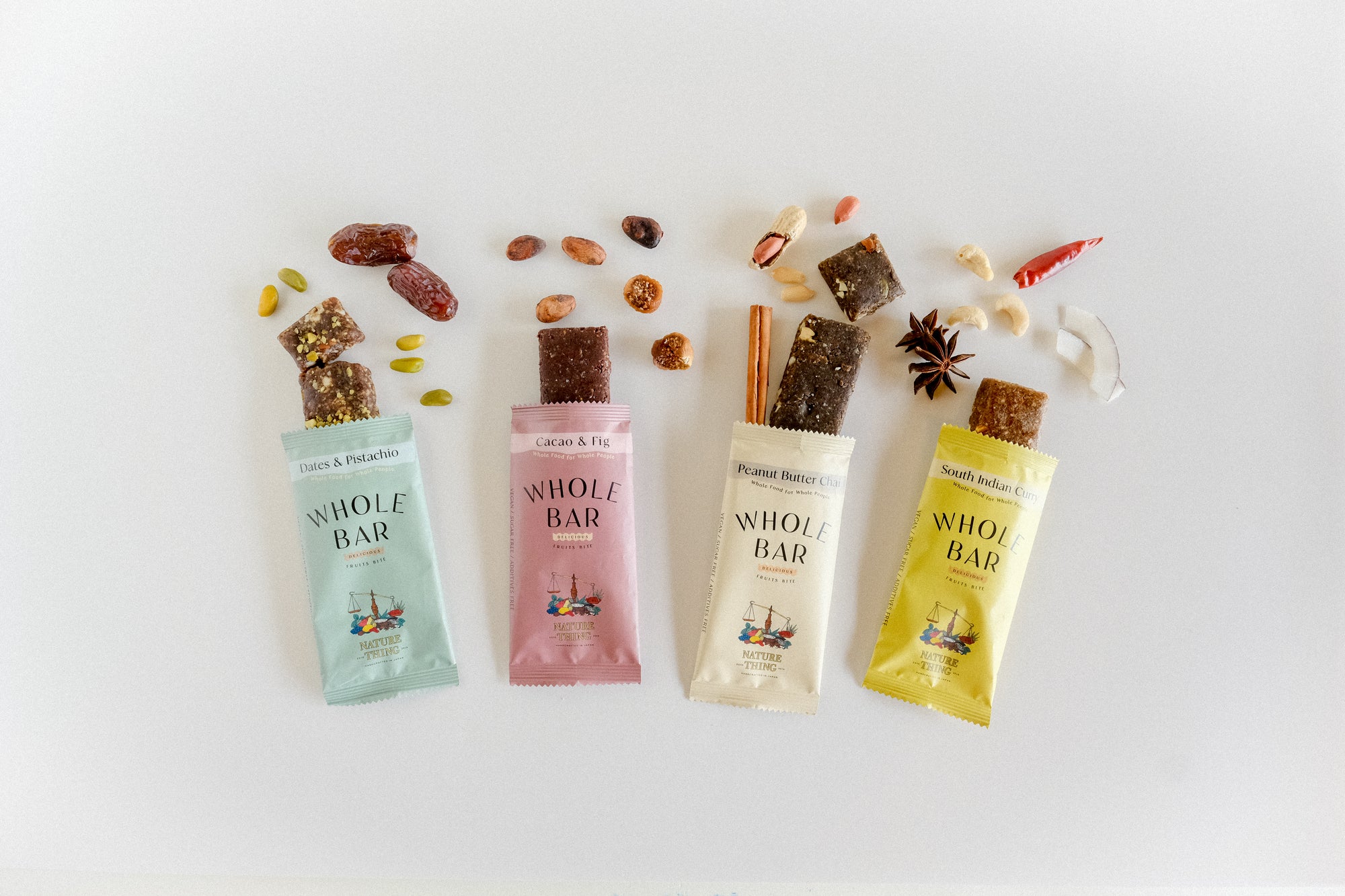 WHOLE BARは、無農薬のデーツと、ハウスメイドのカシューナッツバターとオーツを独自配合することで、フルーツの甘さとナッツのクリーミーさを生み出しました。ベタつかないのに口もパサパサしない、理想的な食感です。